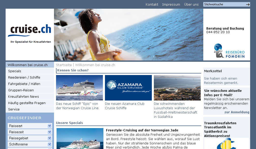 Mehrere Google AdWords-Kampagnen für die Internet-Präsentation "cruise.ch" des Reisebüros Pomorin (Unsere Leistungen im Auftrag der Webworker GmbH: Konzeption und Administration der Kampagnen, Konzeption, Design und Produktion der Landingpages)